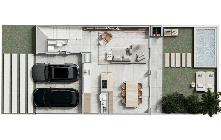 As residências foram projetadas com atenção aos detalhes, oferecendo três suítes, incluindo uma master com um amplo closet. Com dois pavimentos e um ática, cada casa proporciona um ambiente equilibrado entre elegância e funcionalidade. Os acabamentos de alto padrão, como piso em porcelanato 90x90 e tetos rebaixados em gesso, refletem a preocupação com a qualidade e o conforto. Além disso, as vagas de garagem paralelas asseguram praticidade e segurança para todos os moradores.